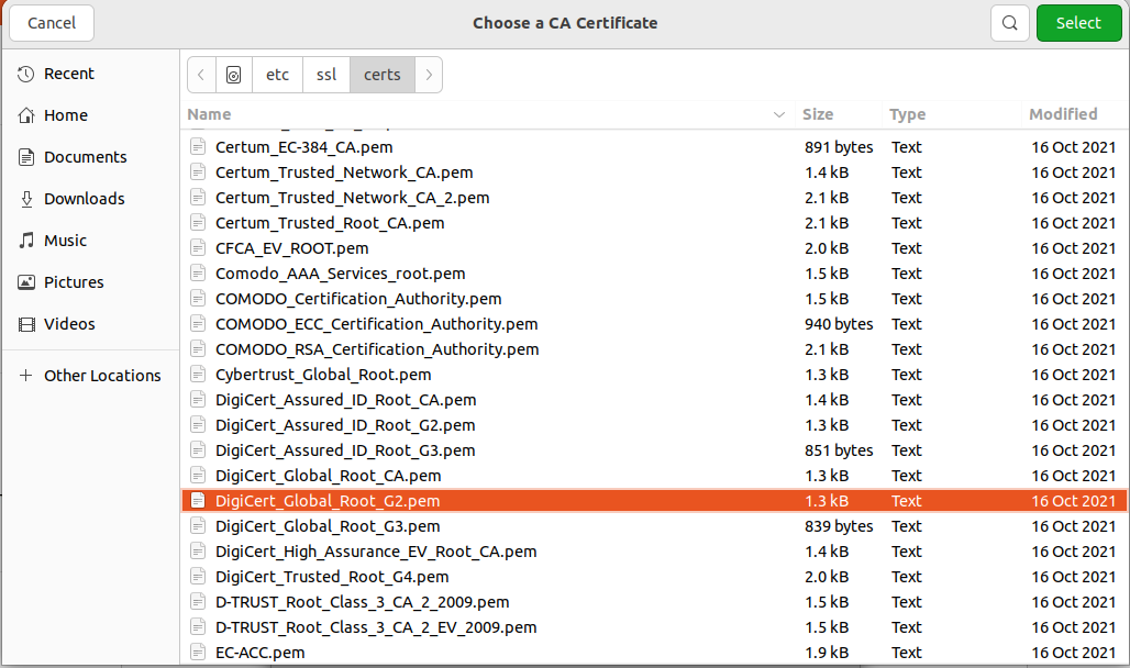 - CA certificate: Click on the down arrow, navigate to etc/ssl/certs, and select the DigiCert_Global_Root_G2.pem certificate; then click Open