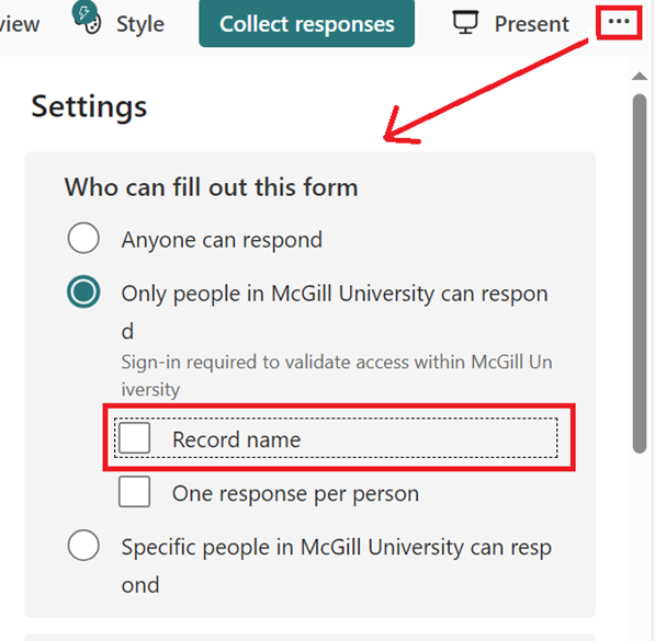 Yes. Just click the three dots at the top right corner to open the Form Settings; then uncheck the box labeled Record name. This will make the form anonymous. Note that you can still require the responder to be a McGill person or member of a specific group.
