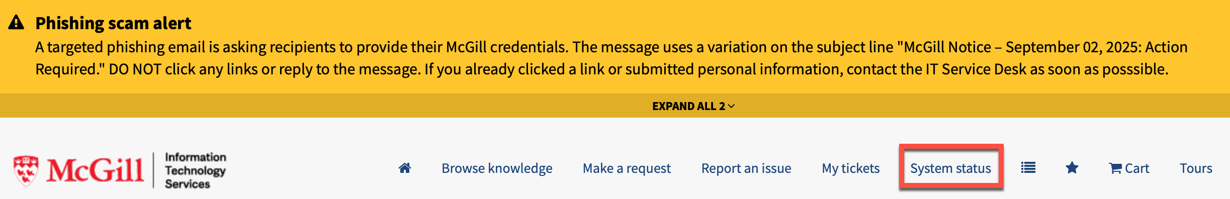 Click System status in the menu at the top to view upcoming scheduled maintenance dates, as well as the history of outages for each of McGill's IT services.