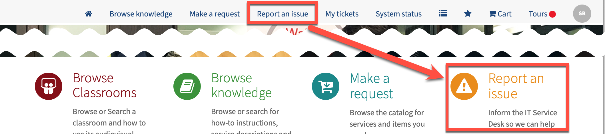 If you can't find any support information in the IT Knowledge Base, or the instructions are not working for you, click Report an issue in the menu at the top of the page.