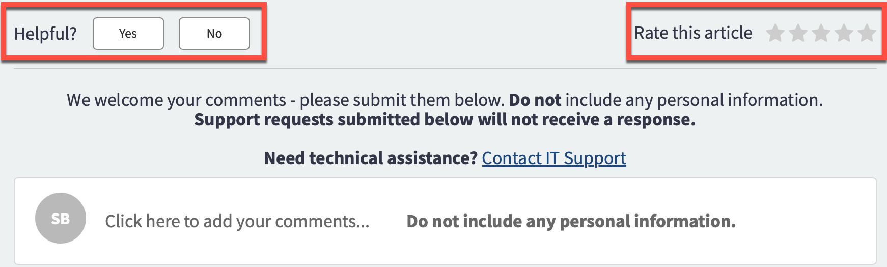 At the bottom of each knowledge article, you can indicate if it was helpful, add comments, and provide a 1 to 5-star rating.
