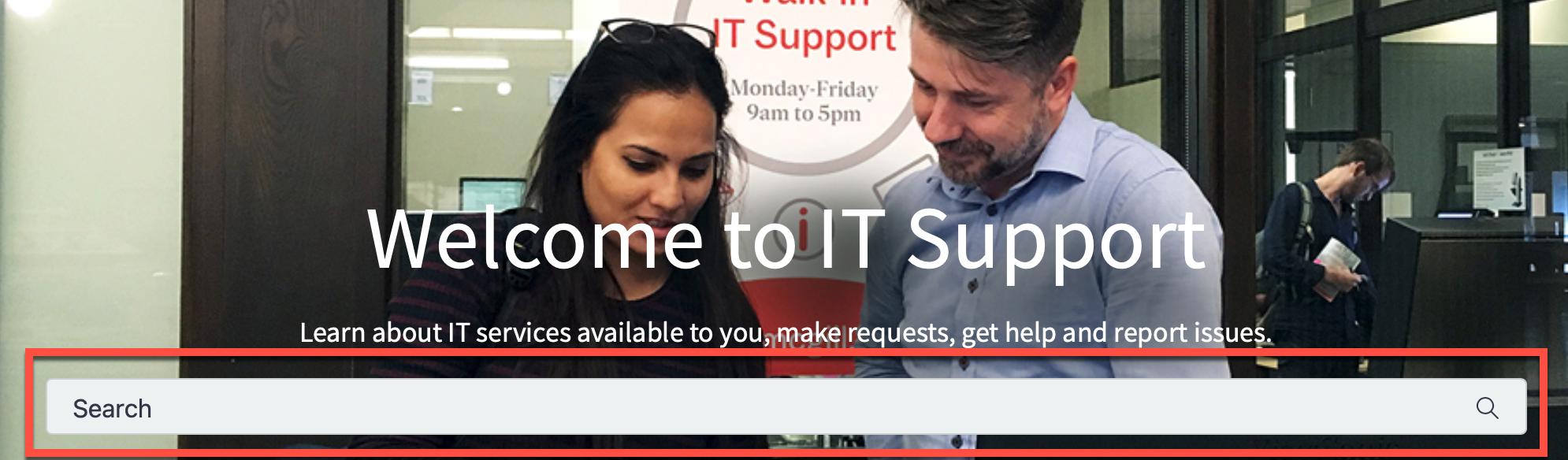 Type a keyword or question into the Search bar at the top of the home page. A list of matching request forms and knowledge articles is displayed. If the list of matches is very long, try adding more specific keywords into the search field.