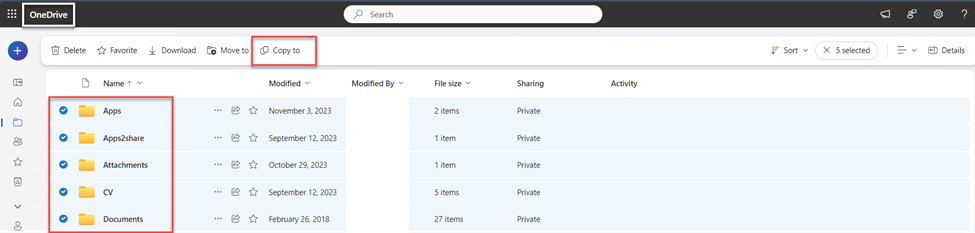 - Navigate to the OneDrive site and select the OneDrive folders to copy to SharePoint.