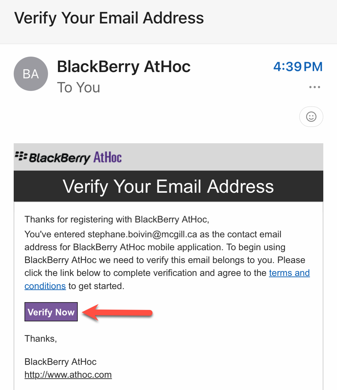 - Go to your email application on your mobile device, open the email from BlackBerry AtHoc and click Verify Now.
