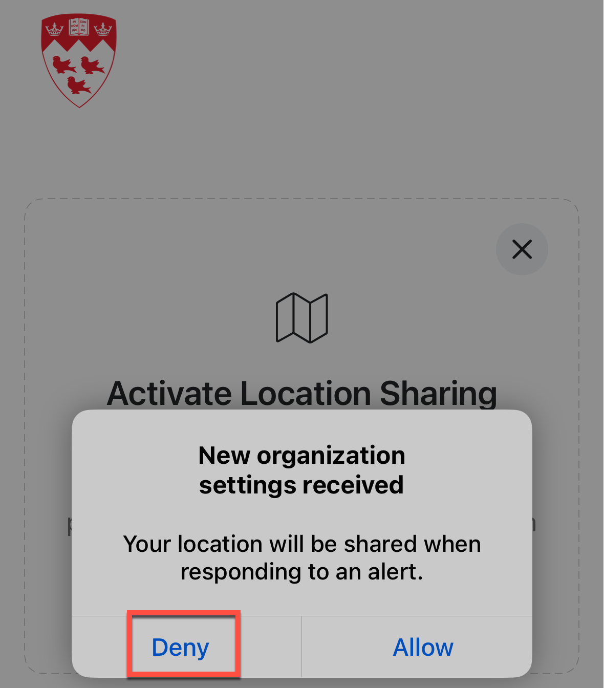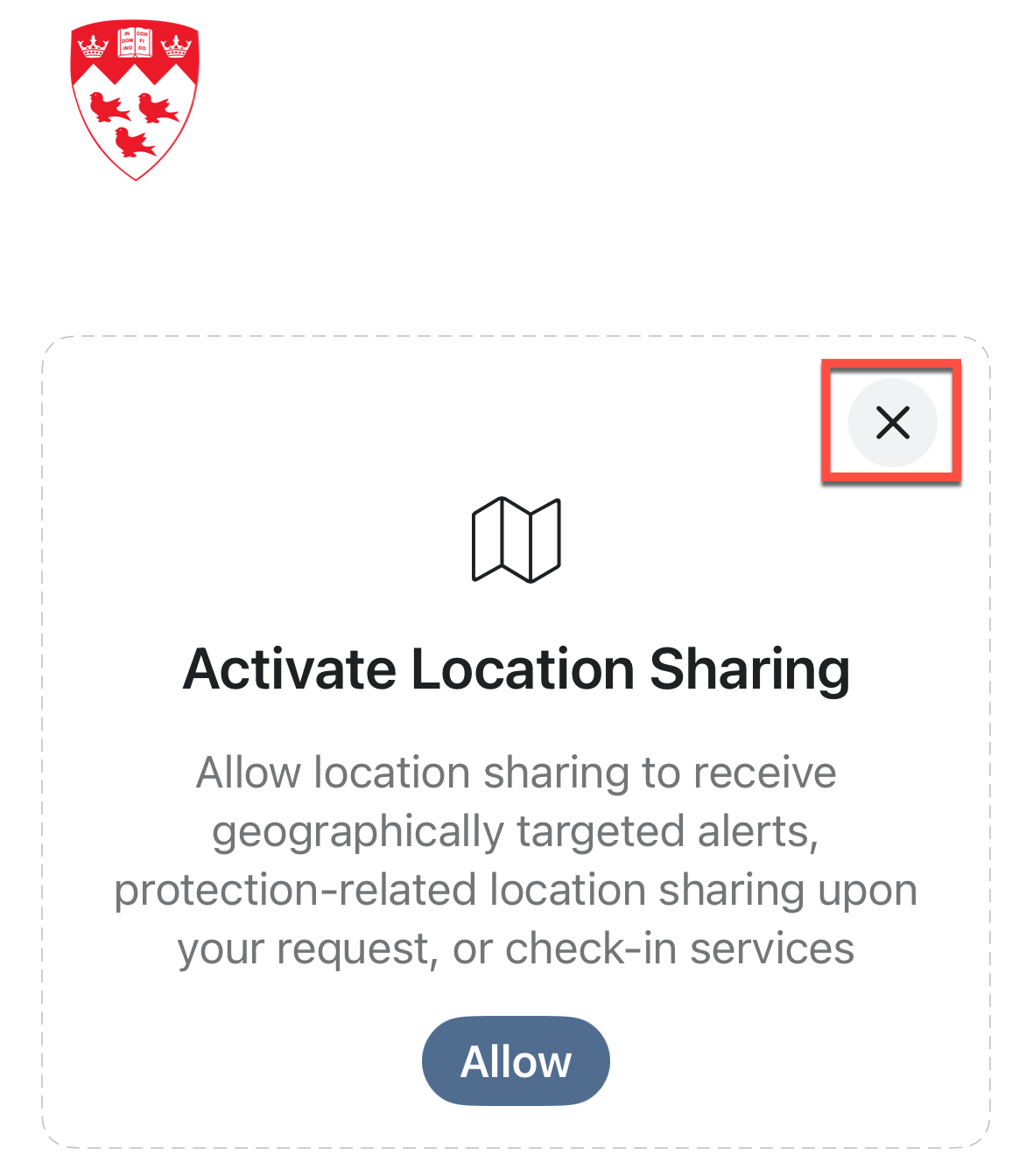 - On Activate Location Sharing, click the X. (We do not track your location.)